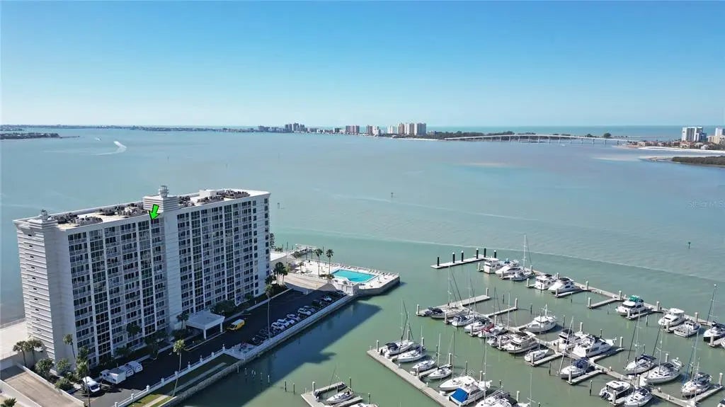 Experience true waterfront penthouse living in this rare double suite residence at Pierce 100, perfectly positioned on the coveted north side of the building with breathtaking, unobstructed views over Clearwater Marina, the sparkling Intracoastal, and the iconic bridge leading to Clearwater Beach. With no neighbors above, this home offers the privacy and quiet that only a top floor residence can deliver. Floor to ceiling glass and expansive sliders flood the interiors with natural light and frame postcard worthy water views from nearly every room, creating a daily backdrop of boats, open sky, and unforgettable sunsets. Step onto your private balcony and feel instantly transported, the perfect place for morning coffee, evening wine, and watching the marina come alive below. The spacious living and dining areas are designed to maximize comfort and scenery, making entertaining effortless with sweeping waterfront vistas that guests will never forget. The primary suite is a serene retreat, beautifully updated with a fresh contemporary feel and direct access to those same stunning views, while the kitchen has been thoughtfully renovated with ample counter space, bright cabinetry, and a convenient pass through ideal for hosting. Pierce 100 delivers resort style living with a secured underground parking garage, a heated waterfront pool surrounded by lounge seating, a fishing pier, and a grill area overlooking the water where dolphins are often spotted just offshore. The Clearwater Beach ferry is only steps away, offering a carefree ride to the beach, world class dining, and entertainment without ever needing to drive. Prime location, penthouse privacy, panoramic marina views, and unbeatable amenities make this an exceptional Clearwater waterfront opportunity.